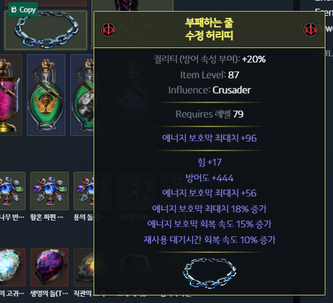 86레벨 수정허리띠에 십자군엑잘을 바른뒤 광산 조밀한 화석을 발라서 만들면 됩니다.