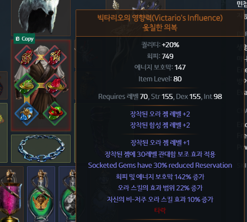 장착된 오라 젬레벨 + 2, 장착된 효과범위 젬레벨 + 2, 모든 저항 최대치 + 1%