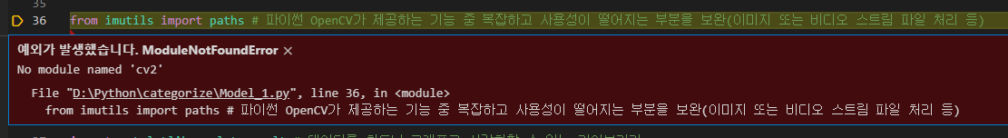 opencv가 설치되어 있지 않아 뜨는 오류로 아래와 같이 설치해 주자