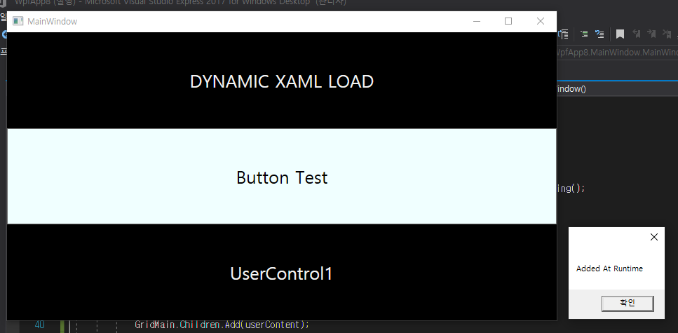 UserControl1.xaml을 런타임중에 MainWindow에 붙인 모습