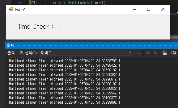 현재 타이머의 간격인 1ms와 출력창의 현재 시간과 옆의 간격 1ms