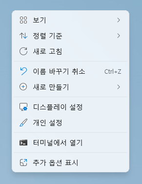 윈도우 11에서 추가 옵션 표시가 생기면서 윈도우 10과는 다른 우클릭 보기로 변경 되었습니다.