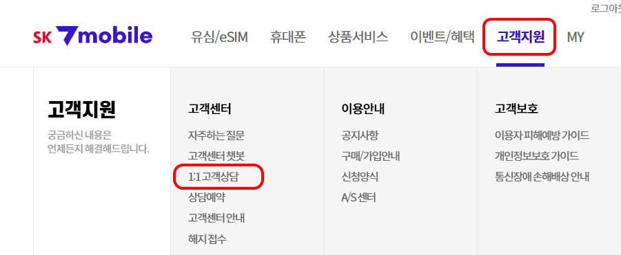 유심이 도착했으면 로그인을 하고 고객지원, 1:1고객상담으로 이동 합니다.