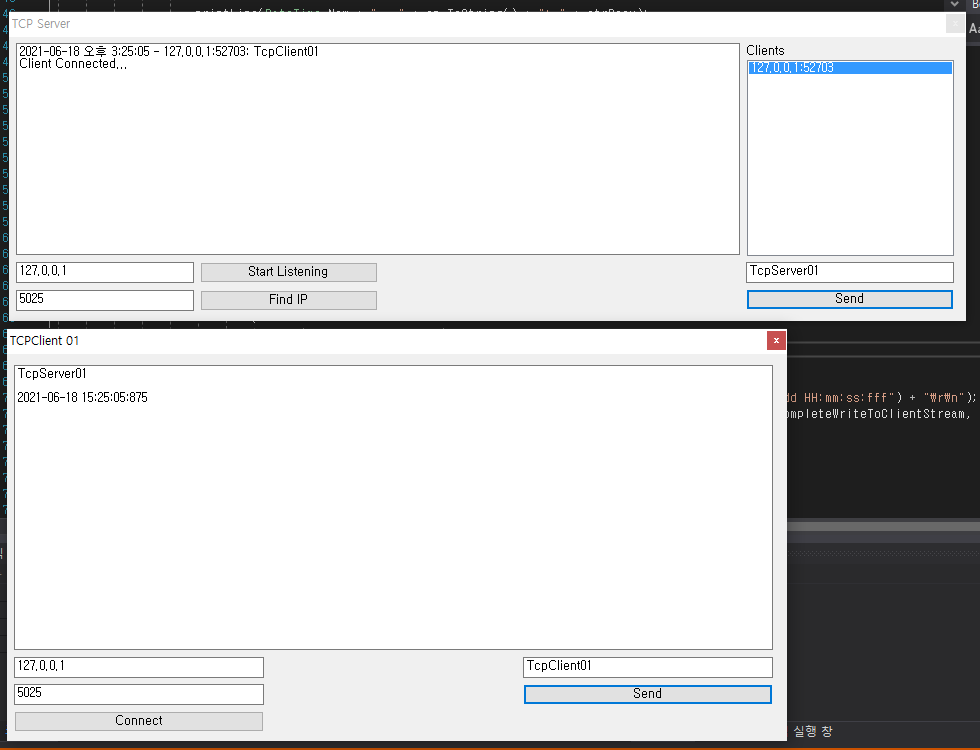 서버측 Clients에서 연결된 클라이언트 선택후 Send 클릭 - 클라이언트측 받은 메시지 표기