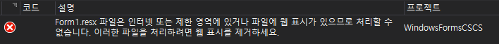 오류 Form1.resx 파일은 인터넷 또는 제한 영역에 있거나 파일에 웹 표시가 있으므로 처리할 수 없습니다. 이러한 파일을 처리하려면 웹 표시를 제거하세요.