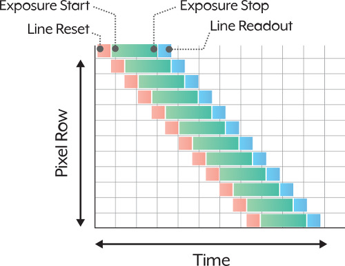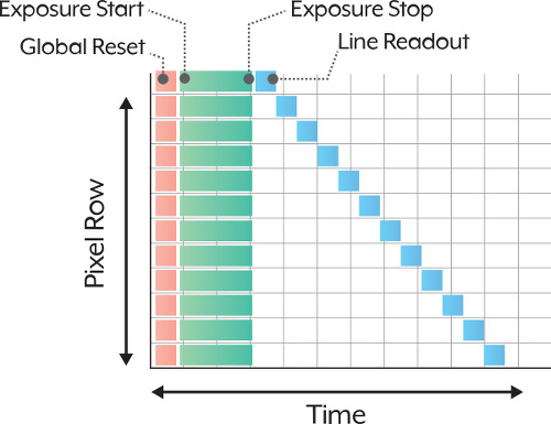 모든 픽셀이 동시에 노출 시작 및 종료 하지만 리드 아웃은 한줄씩 수행 - 워블, 스큐잉이 없음 빠른 속도로 움직이는 물체에 필요